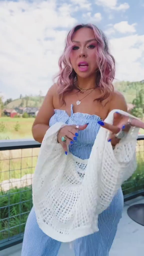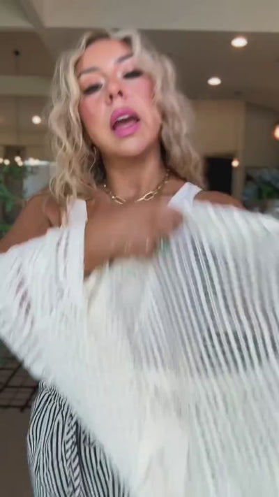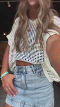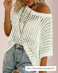Designed with short sleeves and a relaxed pullover silhouette, it drapes beautifully without clinging. The airy hollow-out texture makes it perfect as a swimsuit coverup or an easy spring-summer layering piece.