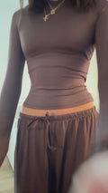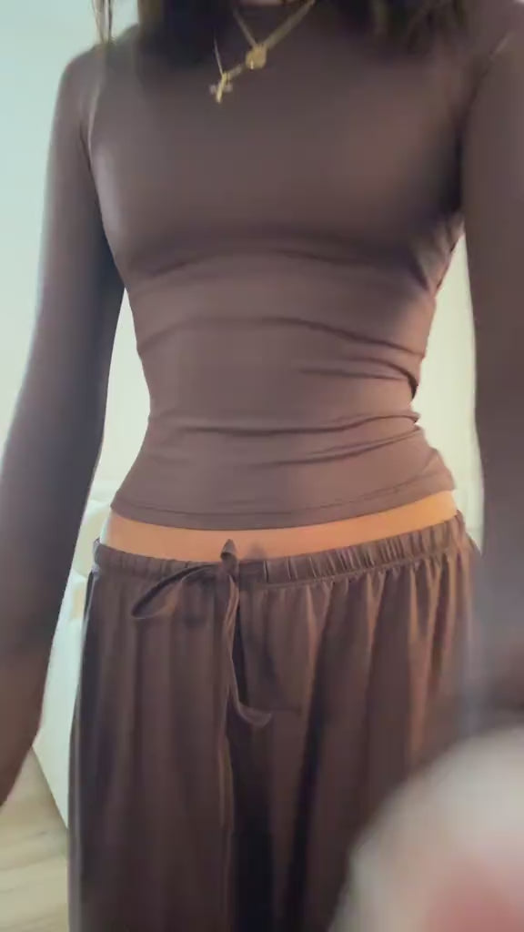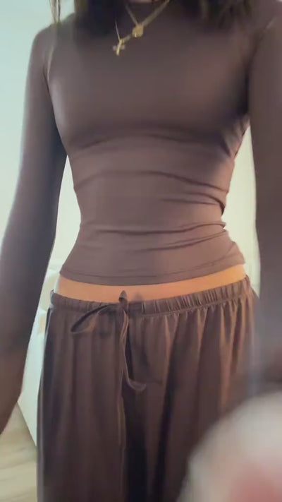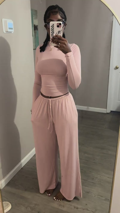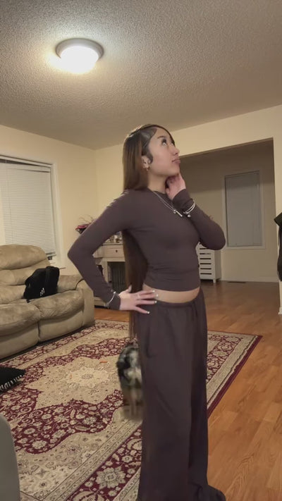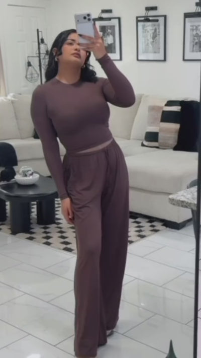 A long-sleeve crop top paired with relaxed wide-leg pants creates an effortlessly stylish look that transitions seamlessly from gym sessions to casual outings and lounging at home.