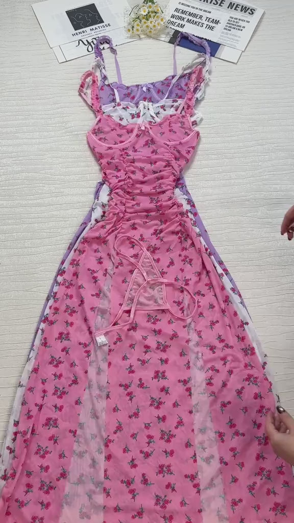 Lightweight, breathable mesh adorned with a dainty floral print. Ruffled spaghetti straps add a delicate, feminine touch.