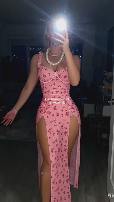 Customizable side ruching allows for personalized length and fit. Extreme double thigh slits provide maximum leg elongation and allure.